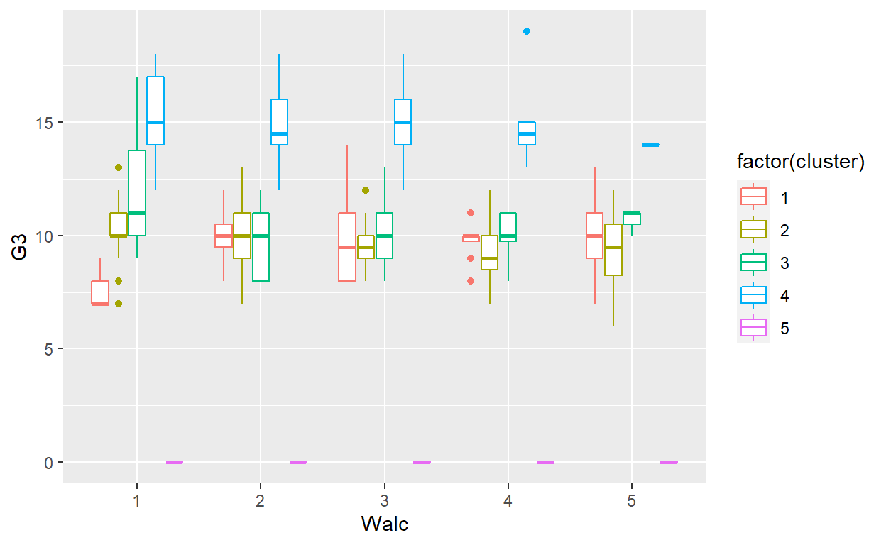 ggplot(MS_Math, aes(x=Walc, y = G3, color = factor(cluster))) + geom_boxplot()