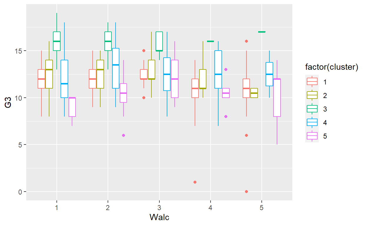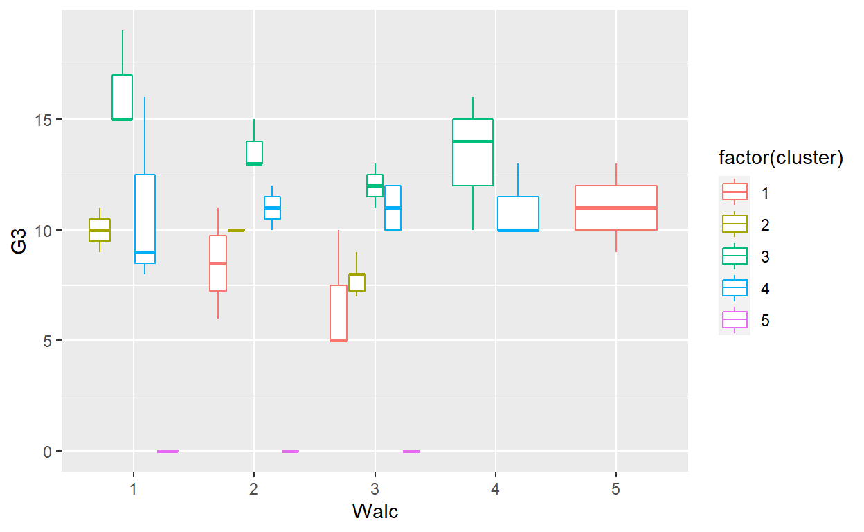 ggplot(GP_Math, aes(x=Walc, y = G3, color = factor(cluster))) + geom_boxplot()
