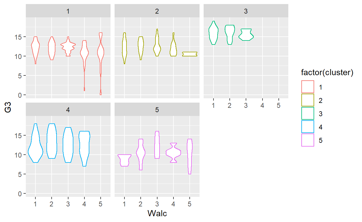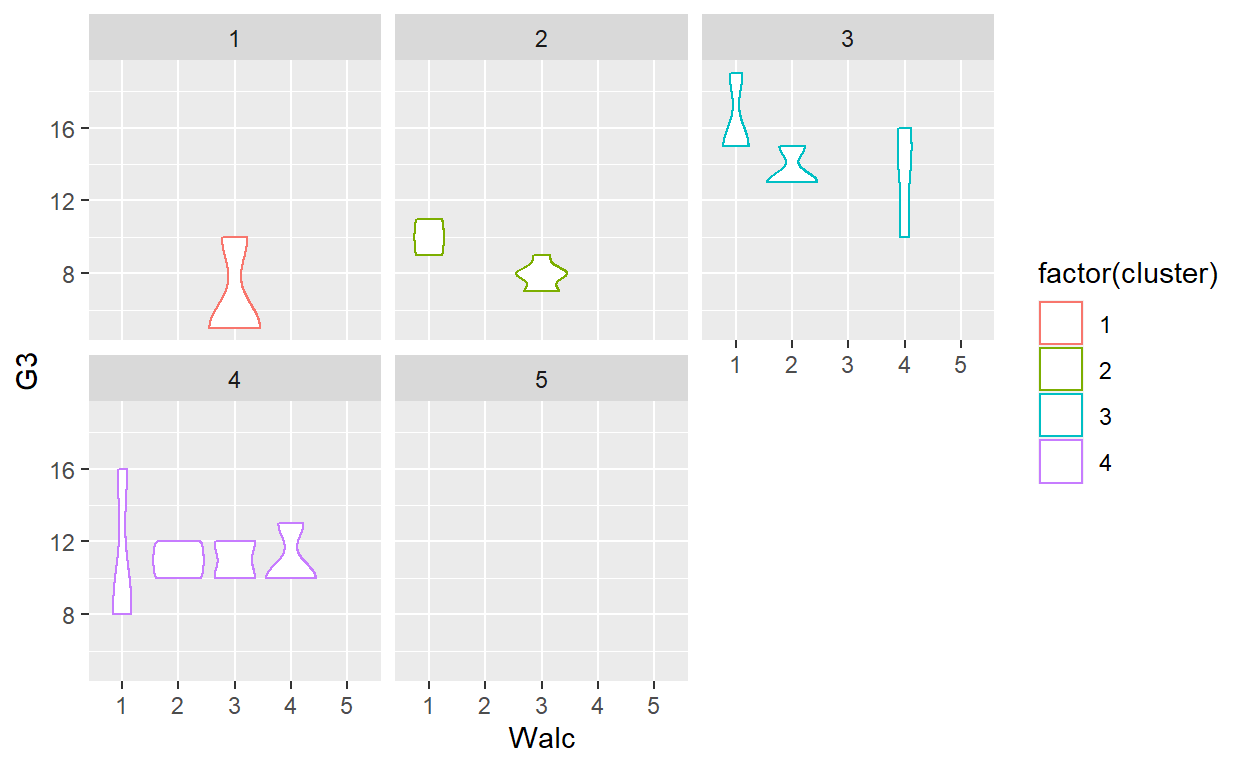 ggplot(GP_Math, aes(x = Walc, y = G3, color = factor(cluster))) +